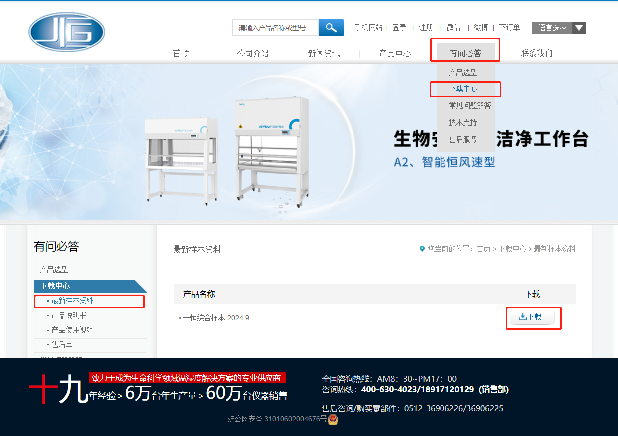 2、點擊導航欄“有問必答”中的“下載中心”找到“最新樣本資料”即可點擊下載。