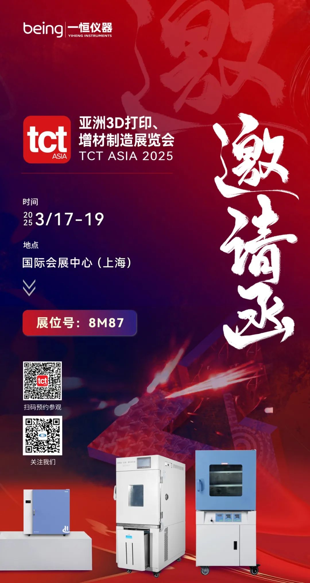 2025-03-04 | 文章來(lái)源: | 點(diǎn)擊率: TCT亞洲展作為亞太地區(qū)增材制造行業(yè)的旗艦展,將于2025年3月17-19日在國(guó)家會(huì)展中心舉行。我們將在展位8M87,現(xiàn)場(chǎng)帶來(lái)真空干燥箱、鼓風(fēng)干燥箱、 高低溫(交變)試驗(yàn)箱等熱銷(xiāo)產(chǎn)品和實(shí)際應(yīng)用案例,期待與您的蒞臨和交流!