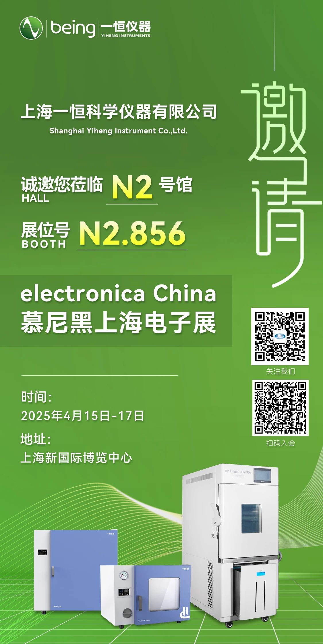 2025-04-08 | 文章來源: | 點擊率: 一恒儀器誠邀您參加將于4月15-17日在上海新國際博覽中心舉辦的2025慕尼黑上海電子展。我們將在現(xiàn)場展示真空干燥箱、鼓風(fēng)干燥箱、高低溫試驗箱等設(shè)備,展位號:N2.856,一恒儀器愿成為您理想的實驗室伙伴。